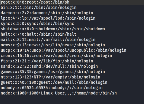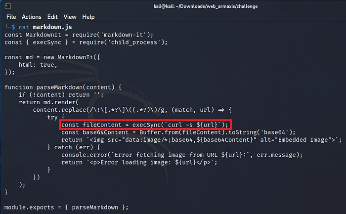 The execSync function executes a curl command to fetch the image, which we can manipulate by providing malicious URLs. For example:  This would instruct the server to fetch and process the contents of /etc/passwd.