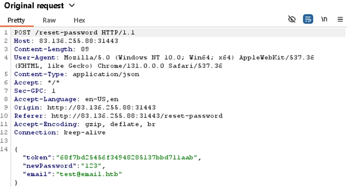After intercepting the password reset request in Burp Suite, We see it included three parameters: token, newpassword, and email.